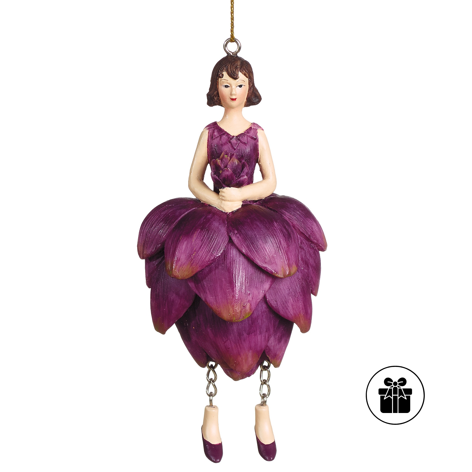 Das Blumenmädchen Artischocke lila beeindruckt mit einem außergewöhnlichen Rock in sanften Violett- und Lilatönen, der an eine blühende Artischocke erinnert. Dieses elegante Design bringt einen Hauch von Exotik in jede Dekoration.