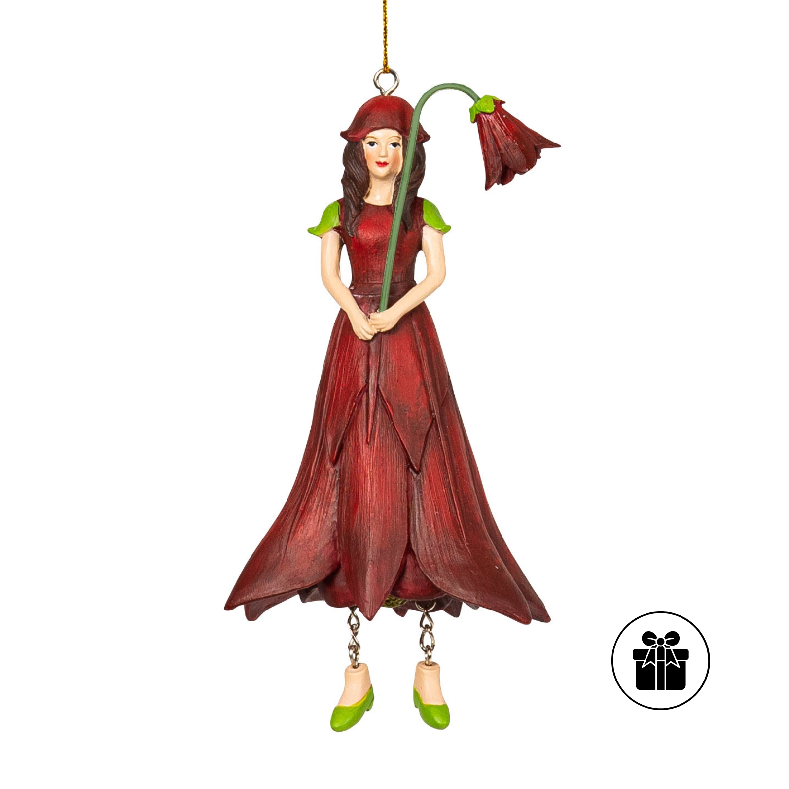 Mit ihrem dunklen roten Kleid, das die grazilen Blüten der Akelei nachbildet, verkörpert dieses Blumenmädchen natürliche Eleganz. Der metallene Stab in ihrer Hand endet in einer filigranen Blütenform und verleiht ihr eine spielerische Note. Das kräftige Rot macht sie zu einem vielseitigen Dekoelement, das sowohl klassische als auch moderne Einrichtungsstile ergänzt.