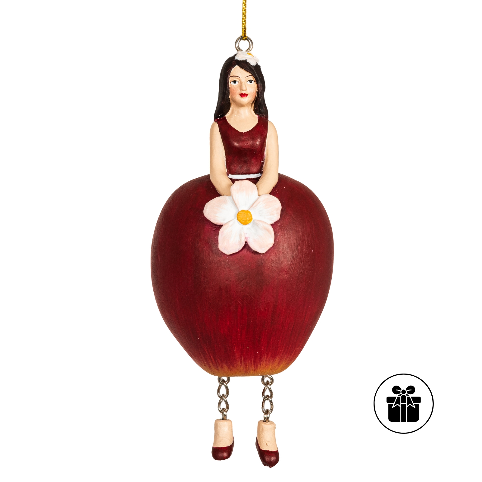 Das Blumenmädchen Apfel rot begeistert mit einem fröhlichen Rock, der an die leuchtend rote Schale eines reifen Apfels erinnert. In der Hand hält sie eine kleine Apfelblüte, die das Design harmonisch abrundet. Mit ihrer goldenen Kordel lässt sie sich vielseitig dekorieren, sei es an Fensterbänken, Herbstkränzen oder an Ästen.