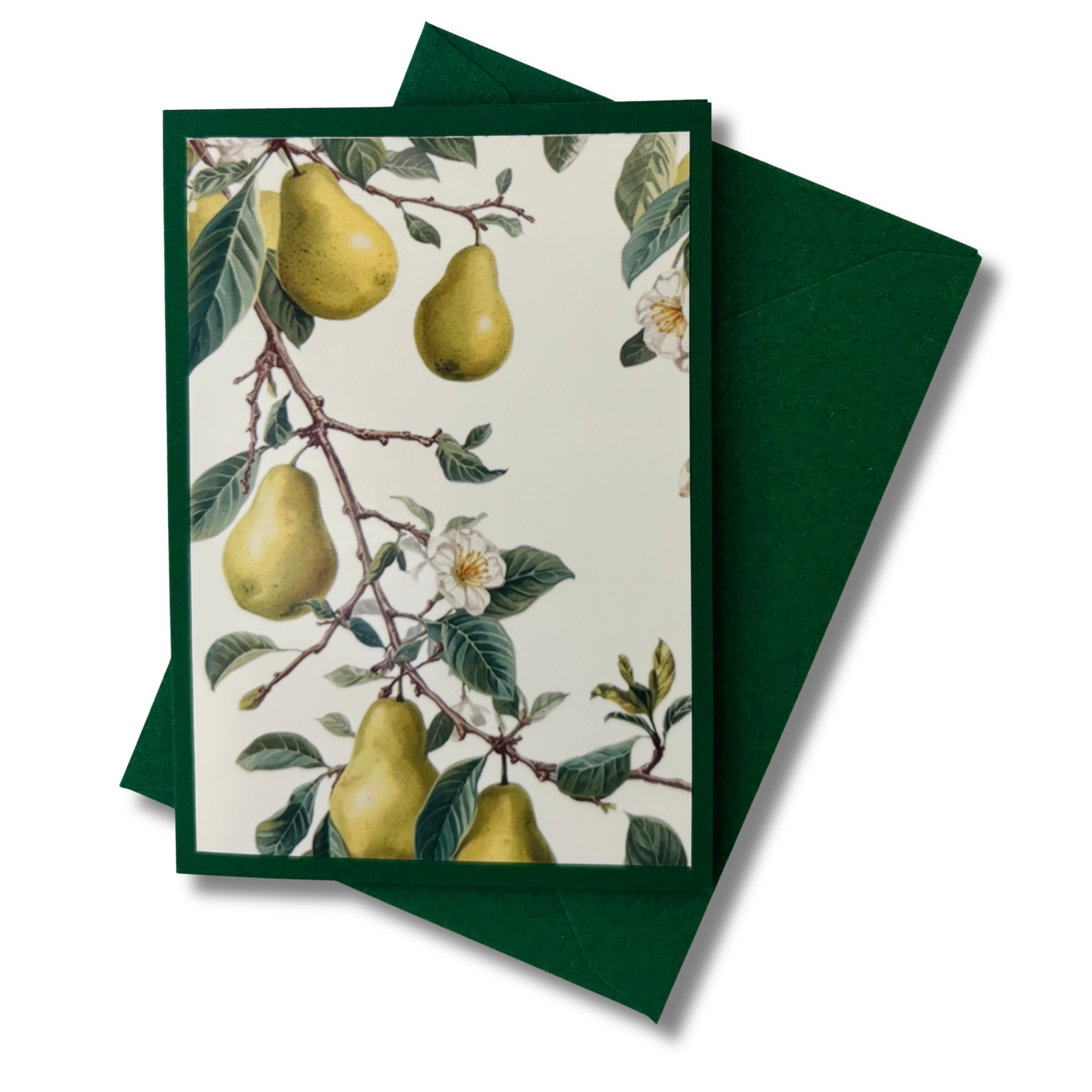 Diese liebevoll gestaltete Mini-Karte greift das Motiv der Birne auf und stellt die Pflanze selbst in den Mittelpunkt. Die Vorderseite zeigt das florale Motiv als zart gerahmten Akzent auf dunklem Grün – abgestimmt auf das grüne Birnen-Blumenmädchen, aber auch für sich ein kleiner Blickfang. Ein separates Einlegeblatt liegt bei und bietet Raum für persönliche Grüße, kleine Botschaften oder feine Gedanken.