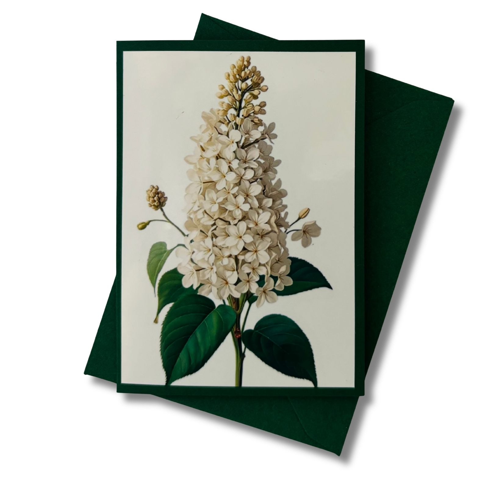 Diese liebevoll gestaltete Mini-Karte greift das Motiv des Flieders auf und stellt die Pflanze selbst in den Mittelpunkt. Die Vorderseite zeigt das florale Motiv als zart gerahmten Akzent auf dunklem Grün – abgestimmt auf das weiße Flieder-Blumenmädchen, aber auch für sich ein kleiner Blickfang. Ein separates Einlegeblatt liegt bei und bietet Raum für persönliche Grüße, kleine Botschaften oder feine Gedanken.