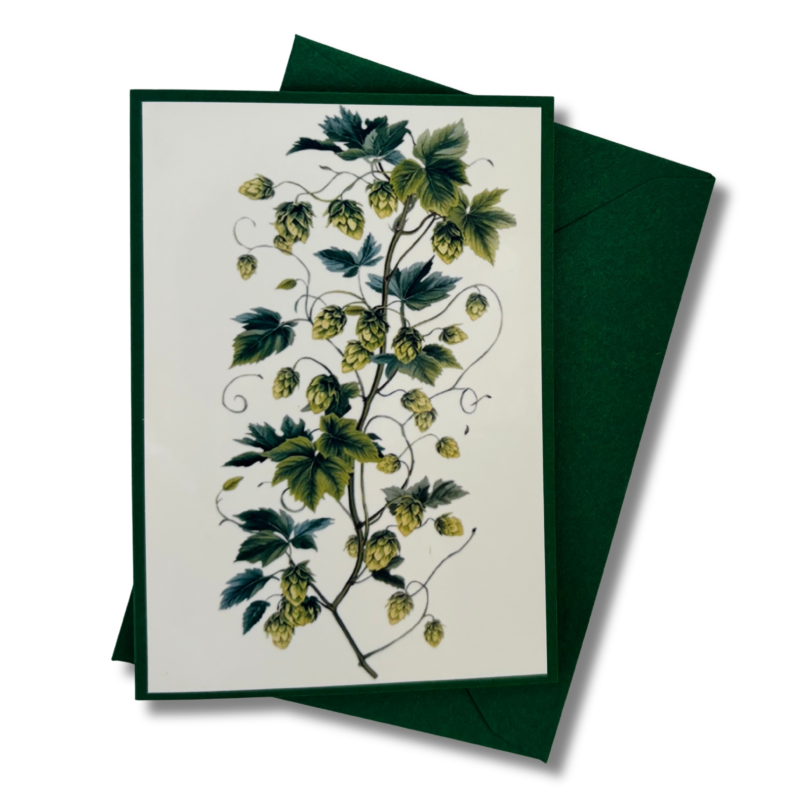 Diese liebevoll gestaltete Mini-Karte greift das Motiv des Hopfens auf und stellt die Pflanze selbst in den Mittelpunkt. Die Vorderseite zeigt das florale Motiv als zart gerahmten Akzent auf dunklem Grün – abgestimmt auf das Hopfen-Blumenmädchen, aber auch für sich ein kleiner Blickfang. Ein separates Einlegeblatt liegt bei und bietet Raum für persönliche Grüße, kleine Botschaften oder feine Gedanken.