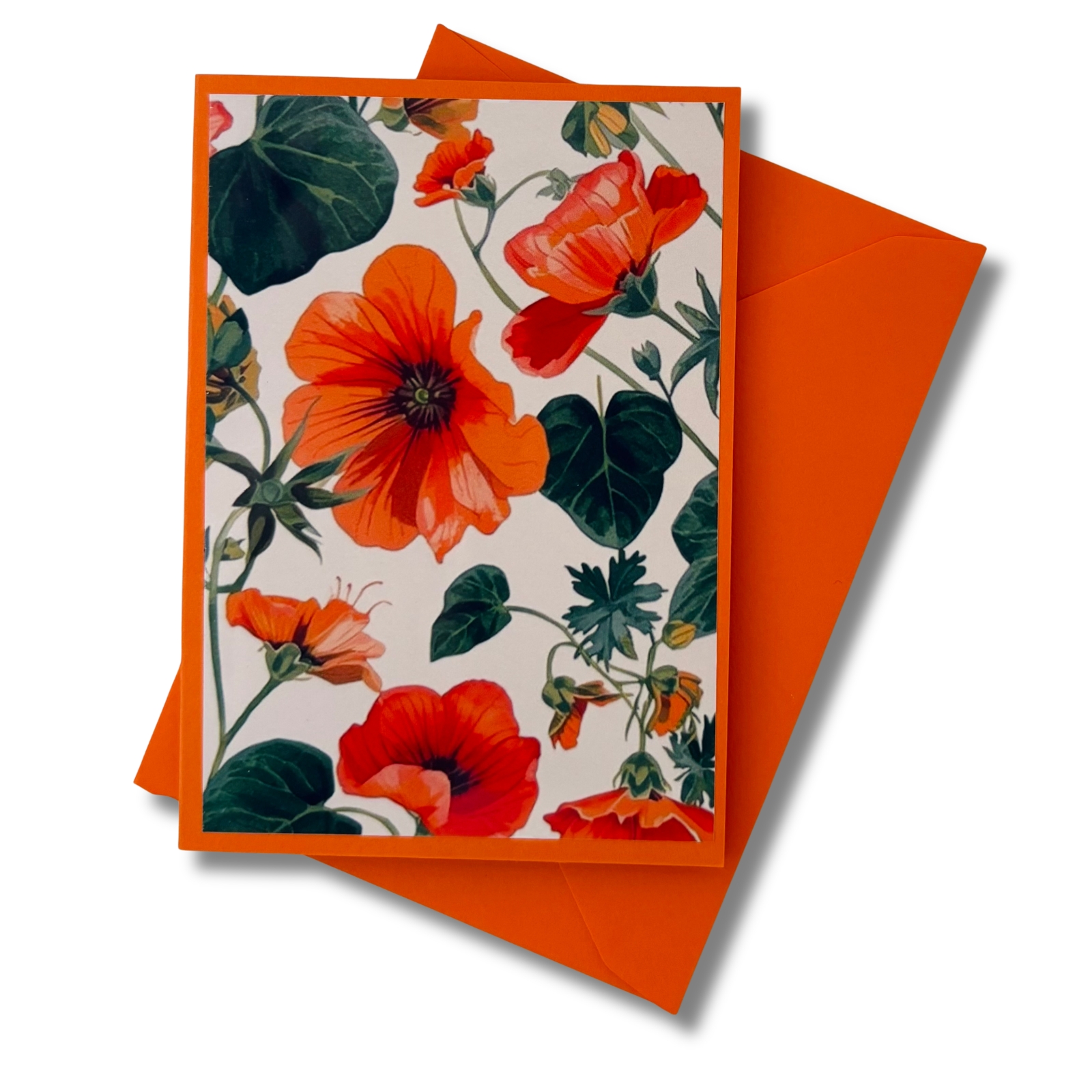 Diese liebevoll gestaltete Mini-Karte greift das Motiv der Kapuzinerkresse auf und stellt die Pflanze selbst in den Mittelpunkt. Die Vorderseite zeigt das florale Motiv als zart gerahmten Akzent auf fröhlichem Orange – abgestimmt auf das Kapuzinerkresse-Blumenmädchen, aber auch für sich ein kleiner Blickfang. Ein separates Einlegeblatt liegt bei und bietet Raum für persönliche Grüße, kleine Botschaften oder feine Gedanken.