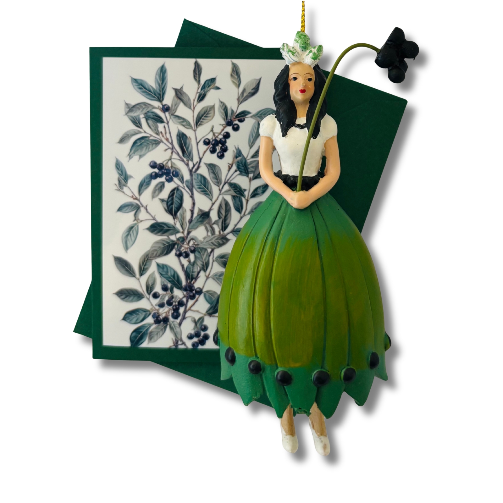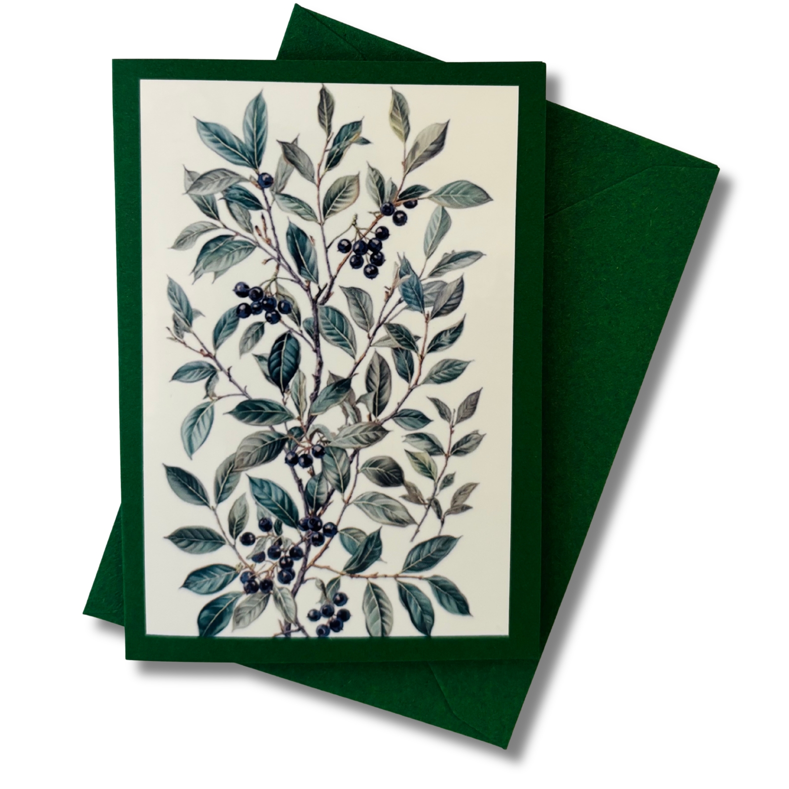 Diese liebevoll gestaltete Mini-Karte greift das Motiv der Ligusterbeere auf und stellt die Pflanze selbst in den Mittelpunkt. Die Vorderseite zeigt das florale Motiv als zart gerahmten Akzent auf dunklem Grün – abgestimmt auf das Ligusterbeeren-Blumenmädchen, aber auch für sich ein kleiner Blickfang. Ein separates Einlegeblatt liegt bei und bietet Raum für persönliche Grüße, kleine Botschaften oder feine Gedanken.