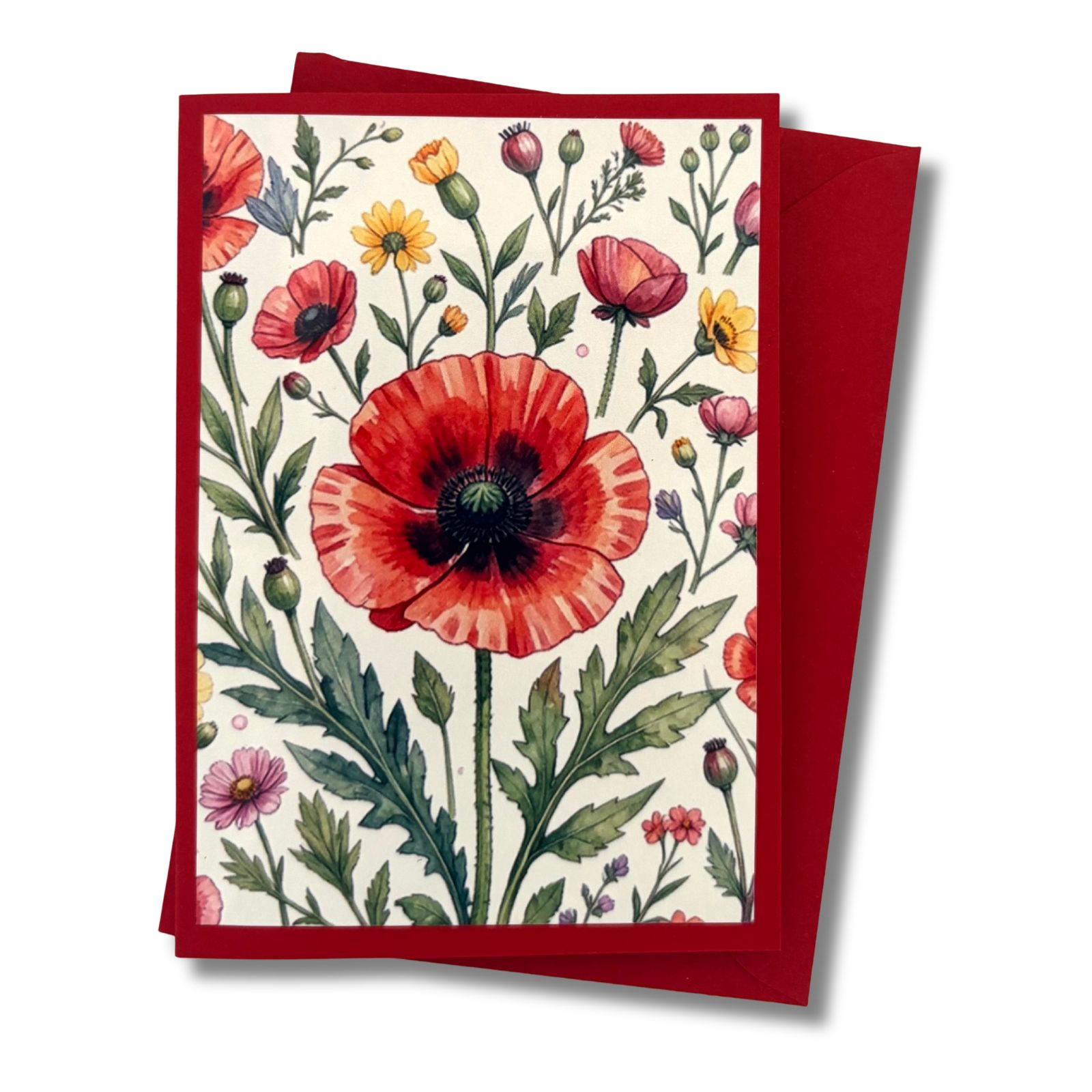 Diese liebevoll gestaltete Mini-Karte greift das Motiv der Mohnblume auf und stellt die Pflanze selbst in den Mittelpunkt. Die Vorderseite zeigt das florale Motiv als zart gerahmten Akzent auf frischem Rot – abgestimmt auf die Mohnblumenmädchen, aber auch für sich ein kleiner Blickfang. Ein separates Einlegeblatt liegt bei und bietet Raum für persönliche Grüße, kleine Botschaften oder feine Gedanken.