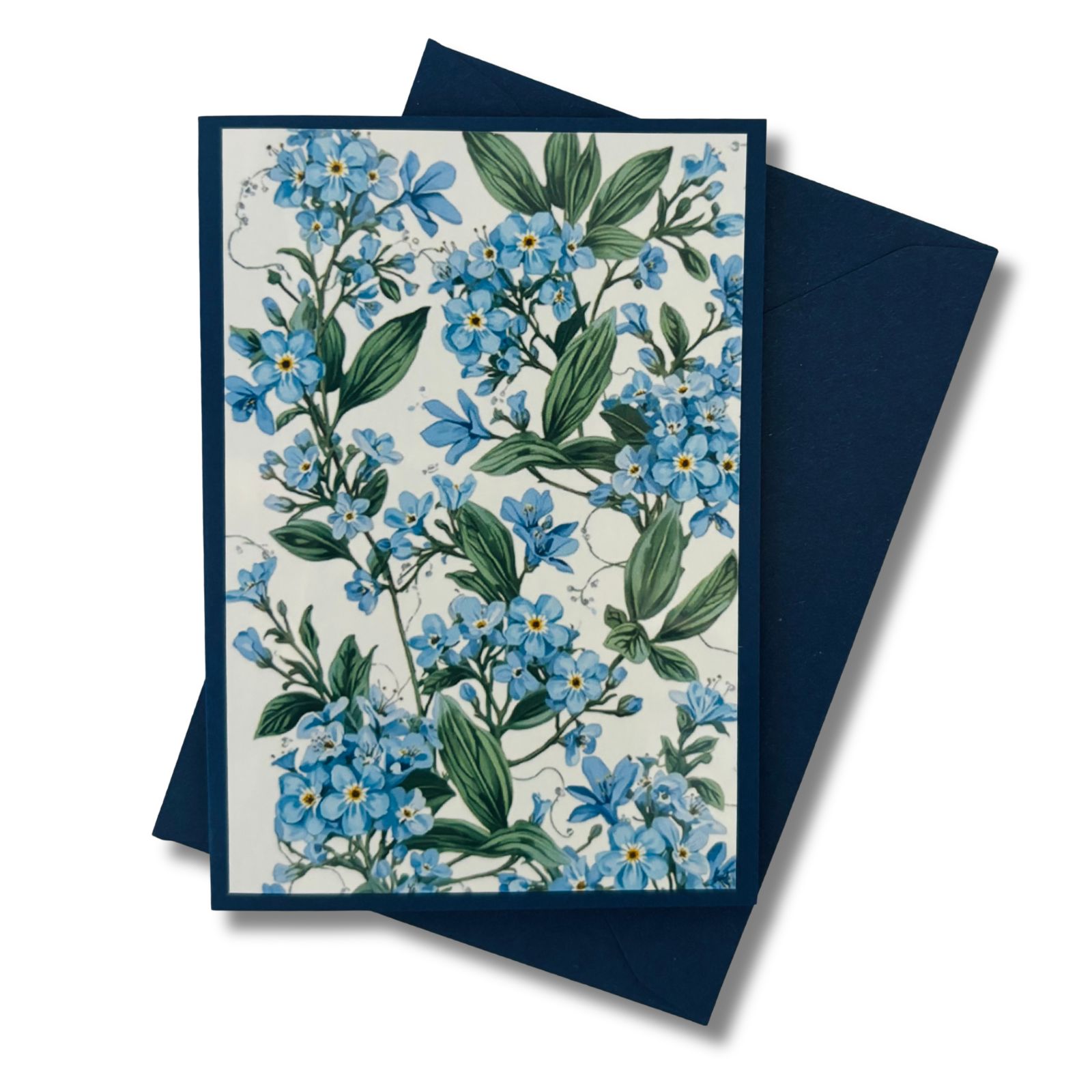 Diese liebevoll gestaltete Mini-Karte greift das Motiv des Vergissmeinnichts auf und stellt die Pflanze selbst in den Mittelpunkt. Die Vorderseite zeigt das florale Motiv als zart gerahmten Akzent auf dunklem Blau – abgestimmt auf das Vergissmeinnicht-Blumenmädchen, aber auch für sich ein kleiner Blickfang. Ein separates Einlegeblatt liegt bei und bietet Raum für persönliche Grüße, kleine Botschaften oder feine Gedanken.